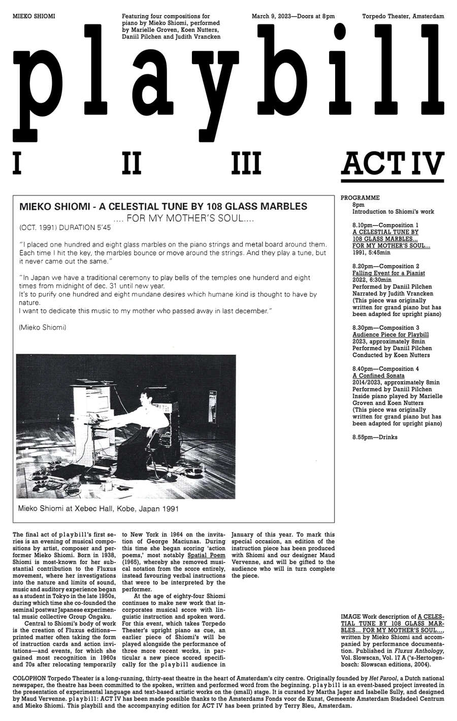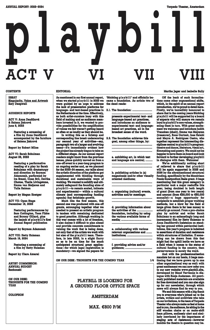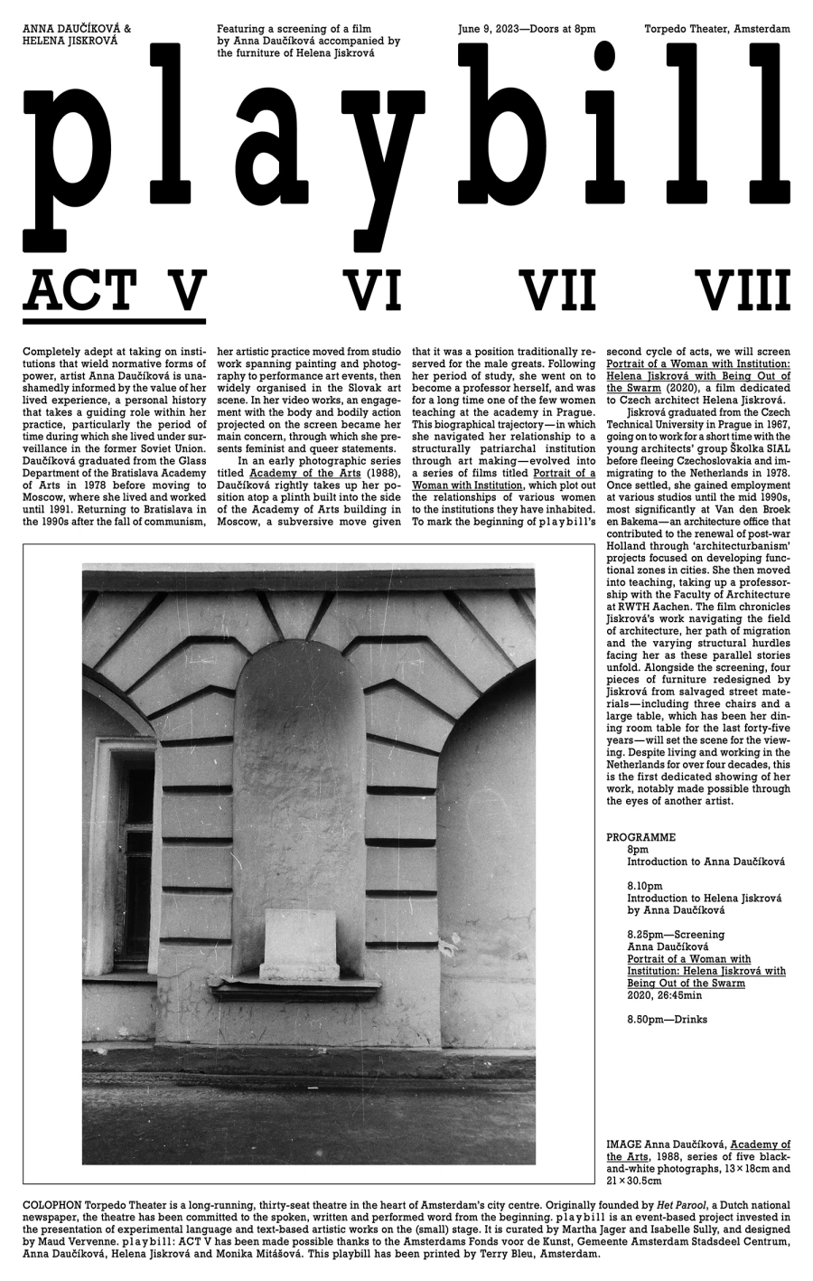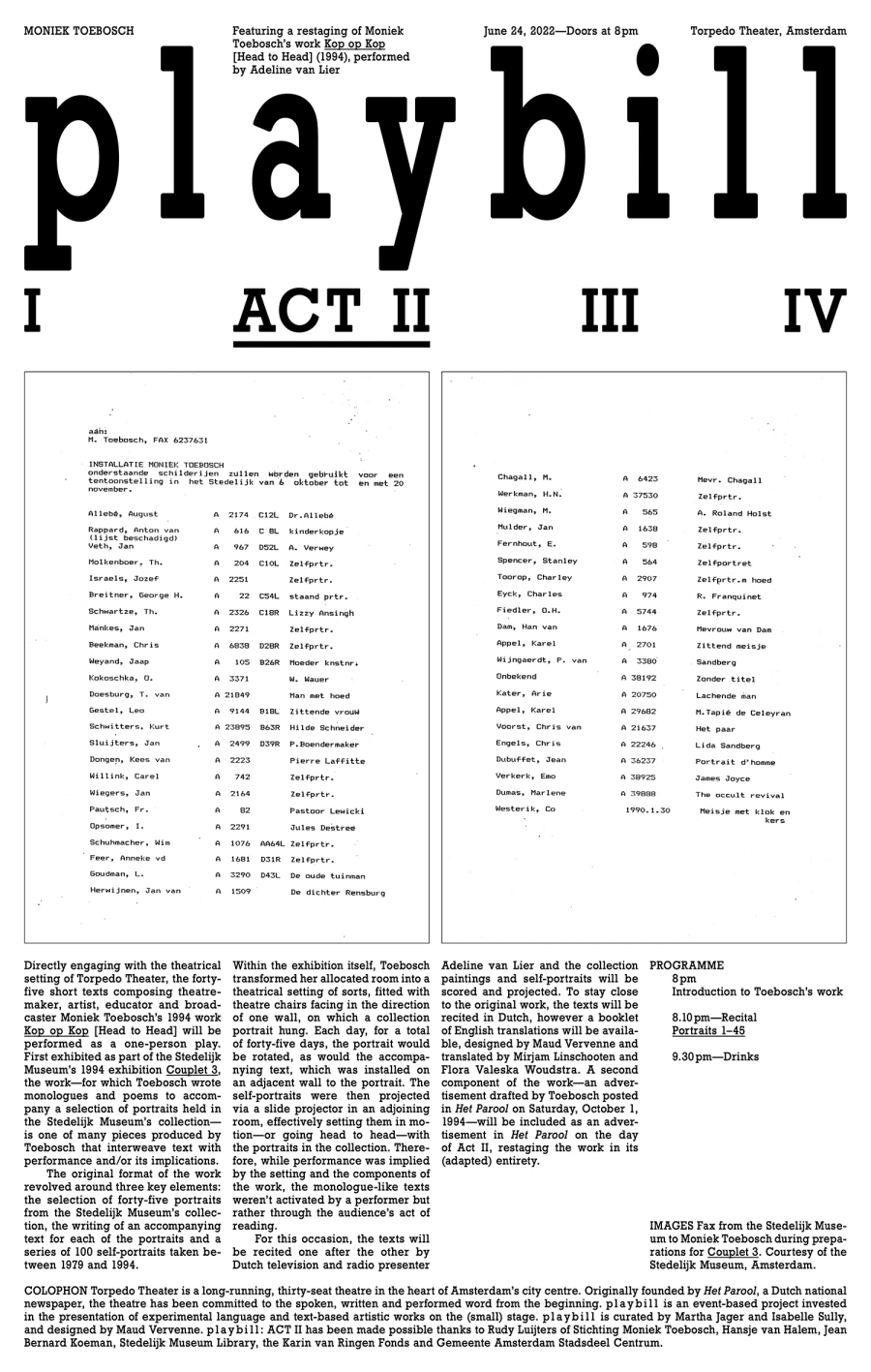 playbill is very excited to welcome you to its new permanent home at Sint Jansstraat, an office that is also an archive that will be, on two occasions throughout the year, a presentation space as well. To celebrate, and to inaugurate a new facet of our activities called SETTINGS, we’re welcoming Moniek Toebosch back to the ‘stage’.