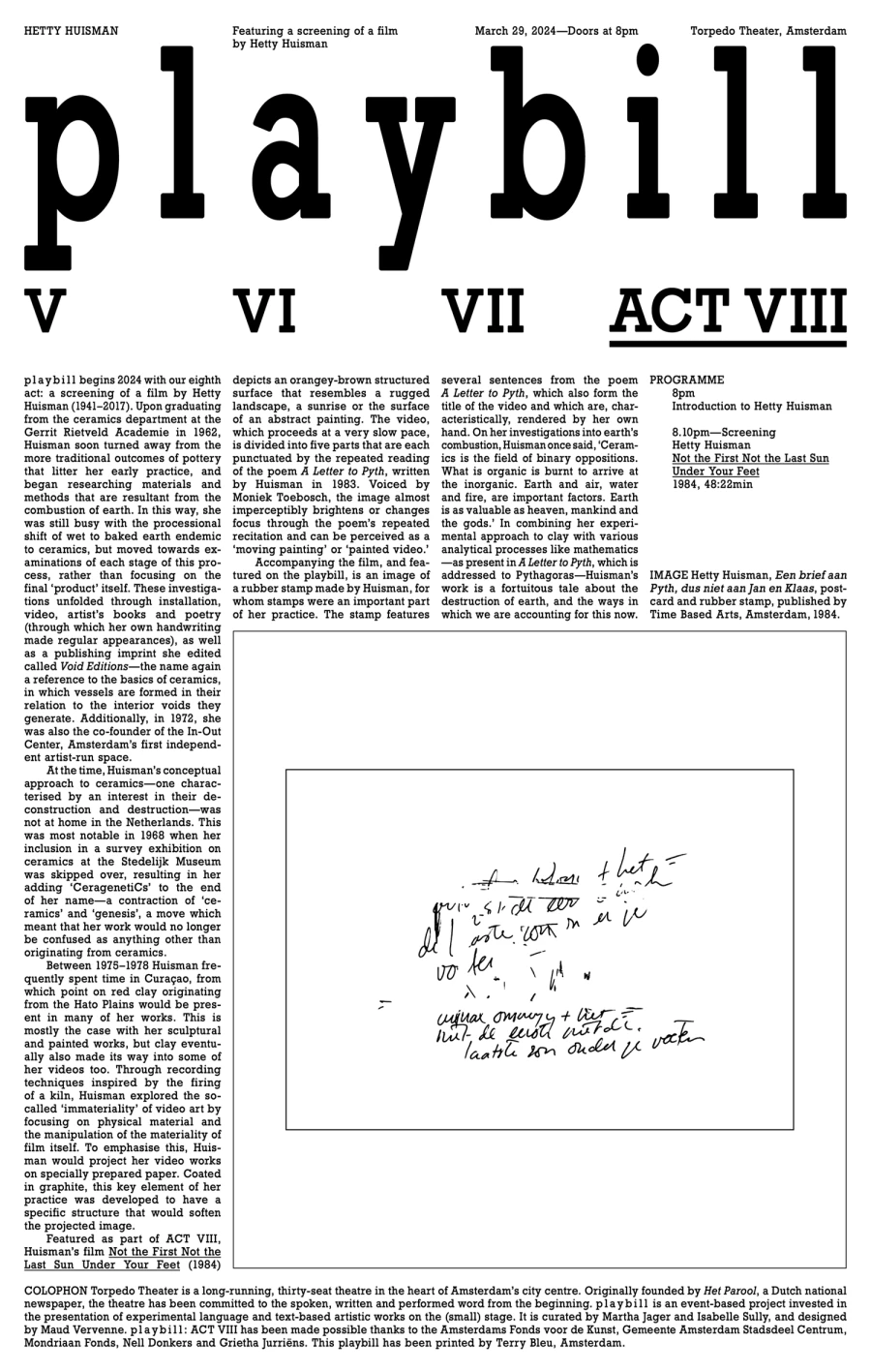 In engaging with the format of a retrospective (and playing with it just as Toebosch did), SETTING I: Moniek Toebosch aims to push at the limits of what exhibition making can be—two films in a semi-renovated space—in turn ensuring we recommit to a promise we set ourselves as a platform when we began, especially given the ‘growth’ that comes with taking on our own space: that being, to stay true to the small-scale. Correspondingly, Toebosch’s presentation at playbill activates connections between historical and future displays of her work, as SETTING I: Moniek Toebosch precedes a large-scale survey exhibition, which is currently being developed by LI-MA, Stedelijk Museum Breda and Rozenstraat – a rose is a rose is a rose, to be launched in 2026. Through Toebosch’s own ‘welcome speech’—and a selection of furniture and household items kindly loaned from Rozenstraat on behalf of the three institutions hosting the survey—we in turn welcome you to this new chapter, where we hope to imbue the hospitality and warmth of Torpedo Theater into Sint Jansstraat 35 as well.